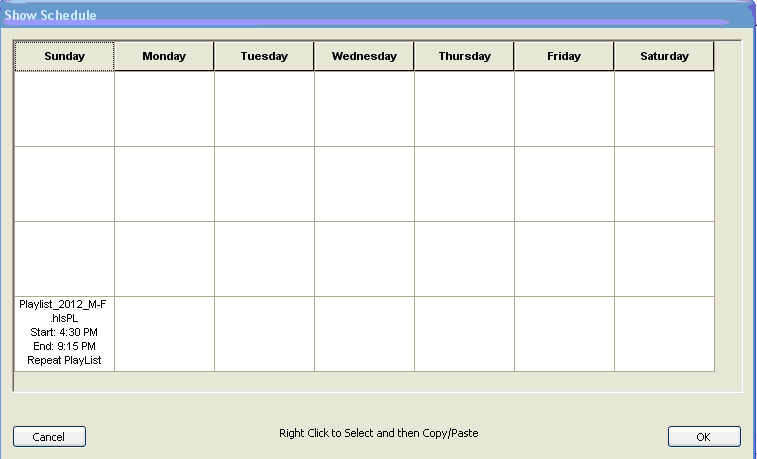 Choose the Output tab at the top of HLS and select Create/Modify Show Schedule. Figure 1-83 shows the weekly schedule. Note that 4 shows can be scheduled with different start and end times each day. Just double click on one of the four boxes for each day to schedule it.